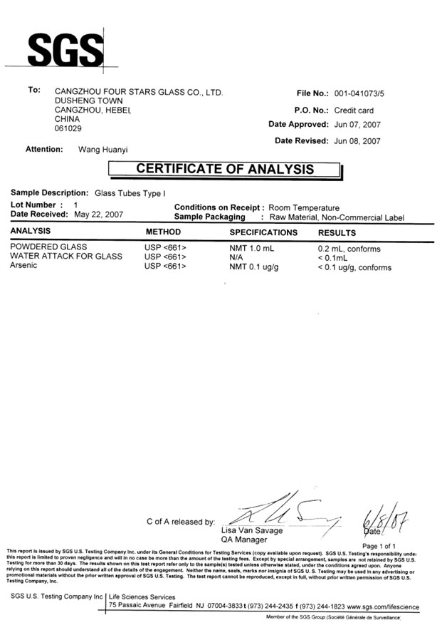 ISO國際標準,玻璃管顆粒法耐水I級為耗酸量小于1ML,國際同行業的數值是0.35ML,而我們是0.2ML(數值越小質量越好),此項技術已經獲得了美國權威檢測機構SGS的檢測證書,此產品已經達到國際先進水平。