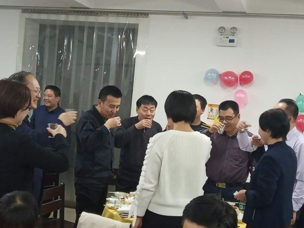 銷售部王云濤總,傾情提了四杯酒,敬董事長,敬自己,敬幕后人員。郝總代表大家為王總斟了一杯大酒,希望他2019年業績所向披靡,拿下5000萬目標。他中招干了半杯,銷售酒量一般都是兩斤啊,神勇。后勤部王震山總勇猛做陪,一起炸了半杯。