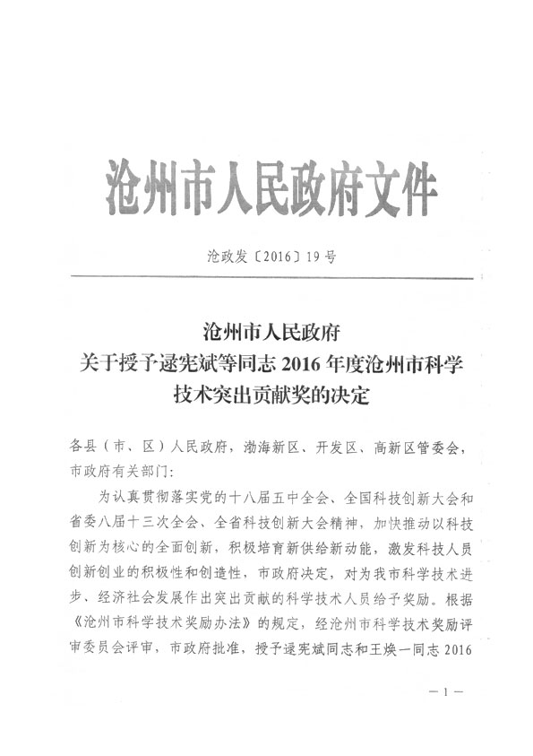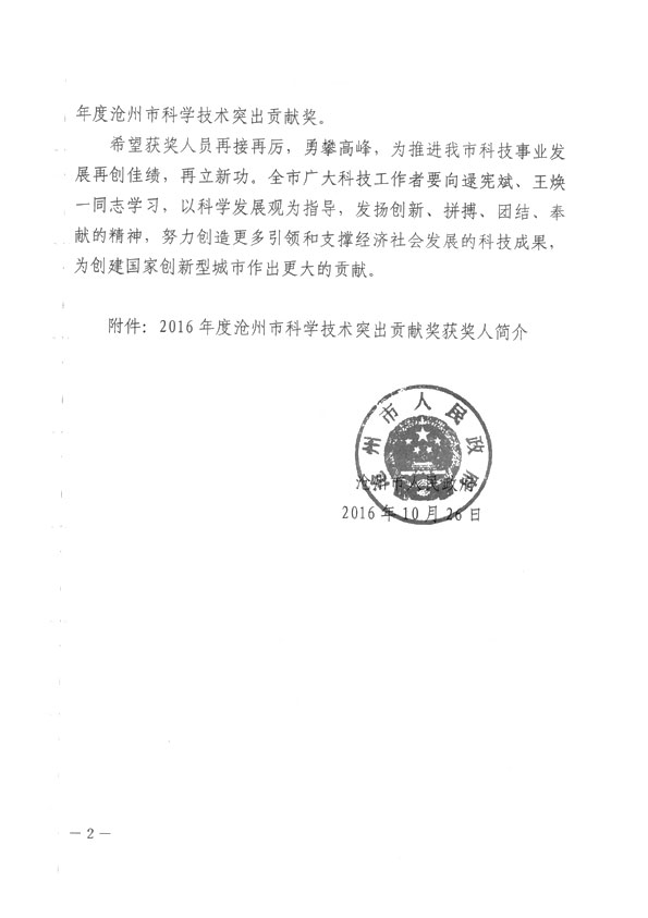 滄州市人民政府授予王煥一先生2016年科學(xué)技術(shù)突出貢獻(xiàn)獎(jiǎng)