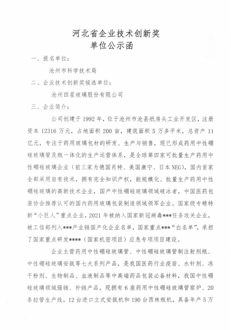 河北省企業(yè)技術(shù)創(chuàng)新獎(jiǎng)單位公示函